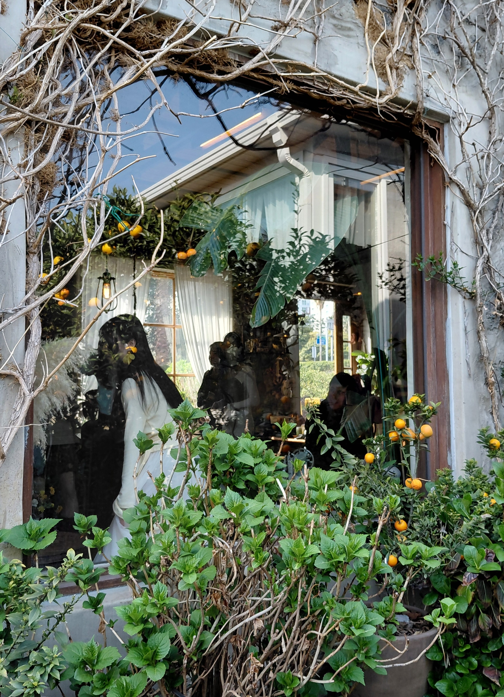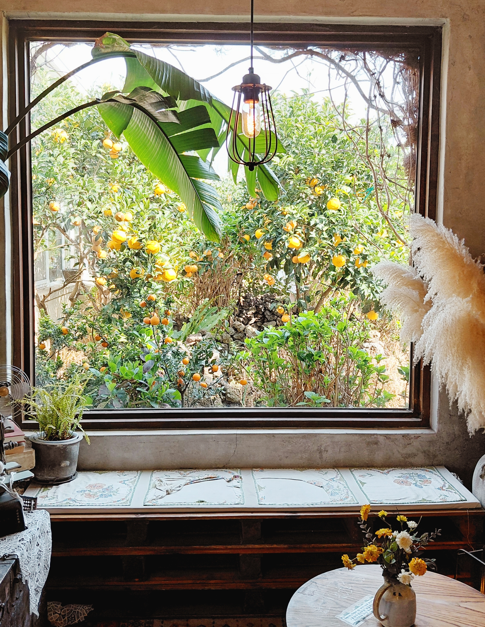 창밖 하귤밭 배경이 예쁘게 나온다.