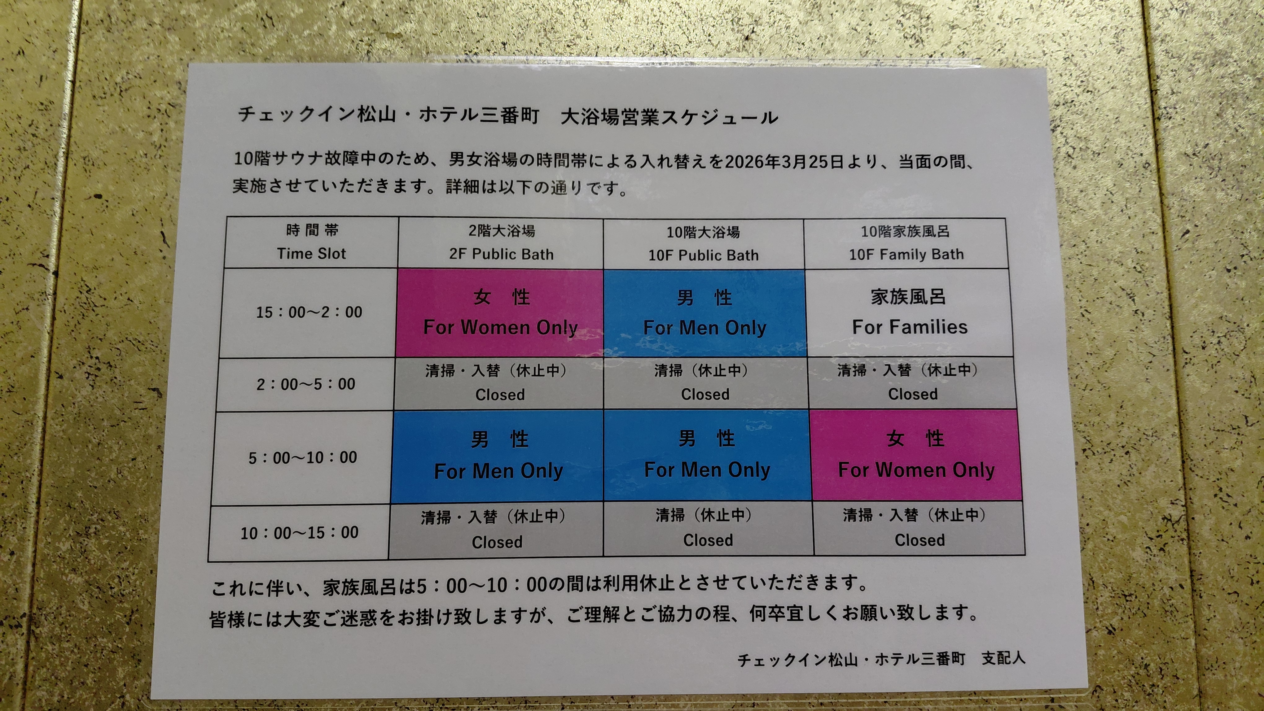 오전 시간대에는 10층 대욕장을 이용해야 한다는것을 기억해라.